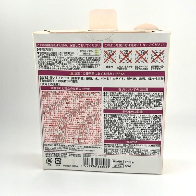 低温やけど防止のためのご注意:●低温やけどは、体温より高い温度の発熱体を長時間あてていると紅斑、水疱等の症状をおこすやけどのことです。なお、自覚症状をともなわないで低温やけどになる場合もありますのでご注意ください。●肌に直接貼らないでください。●就寝時は絶対にご使用にならないでください。また、着用したまま寝てしまわないようご注意ください。●熱すぎると感じた場合は、すぐにご使用を中止してください。また、すぐに取り除けない状況でのご使用はおやめください。●時折、肌の状態を確認し、赤み・かゆみ・痛み等ややけどの症状が現れた場合はすぐにご使用を中止してください。お子さまやお肌の弱い方は特にご注意ください。●下着等、薄い衣類の上からご使用の場合は、特にご注意ください。肌にあたる温度が41℃を超えない目安でお使いいただけますよう、衣類等をご調整ください。●乳幼児、幼少児、高齢者、身体の不自由な方など自らの意思ですぐにご使用を中止できない方はご使用にならないでください。●こたつ、寝具の中でのご使用や暖房器具との併用は高温になるため絶対にしないでください。●糖尿病など、温感および血行に障害のある方はご使用しないでください。●温熱で湿疹や蕁麻疹が出る方、温熱に敏感な方、温感が低下している方はご使用にならないでください。●ベルトやサポーター、椅子等で圧迫した状態ではご使用にならないでください。また、押し付けるようにして横にならないでください。●粘着部分がシワになったり、シートが浮いたり剥がれたりしないように貼ってください。●同じ箇所に複数枚のご使用は、高温になりますのでおやめください。●万一やけどの症状があらわれた場合はすぐにご使用を中止し、医師に相談してください。香りについてのご注意:●香りで気分が悪くなった場合はご使用を中止してください。●肌に異常を感じた場合は直ちに使用を中止し、医師にご相談ください。●合成香料も使用しております。香りアレルギーの方はご注意ください。●香りの液体がついた手で目や粘膜等に触れない様にご注意ください。また、香りの液体が衣服などにつかないようご注意ください。香りの液体が肌についた場合は、石けん等を使用してよく水で洗い流してください。●香りカプセルは1回使い切りです。残った分は処分してください。その他のご注意:●ご使用後は市区町村の区分に従ってお捨てください。●人体以外へは使用しないでください。●大切な衣類へのご使用はお控えください。繊維が粘着剤に付着して衣類が傷んだり、粘着剤が残る場合があります。香料が衣類へ付着すると変色する場合がありますので、カイロの香りを垂らした側に触れる衣類にもご注意ください。衣類に付着した場合は、衣類の洗濯表記に従ってお洗濯されることをお薦めします。●一度貼ったカイロを貼り直すと粘着力が低下します。●一部の保温性衣類では、カイロが付きにくいことがあります。●本品は食べられません。万が一飲み込んだ場合は、内容物を吐き出し医師の診断を受けてください。●用途以外でのご使用はおやめください。●妊娠中・授乳中、現在通院中の方、持病により本品のご使用に不安がある方は医師に相談してからご使用ください。